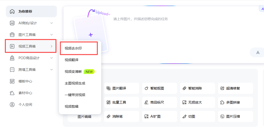 视频去水印功能位于【视频工具箱】-【视频去水印】中,该功能仅需上传视频,即可轻去除视频水印。
