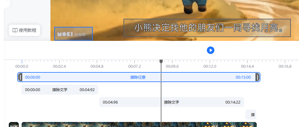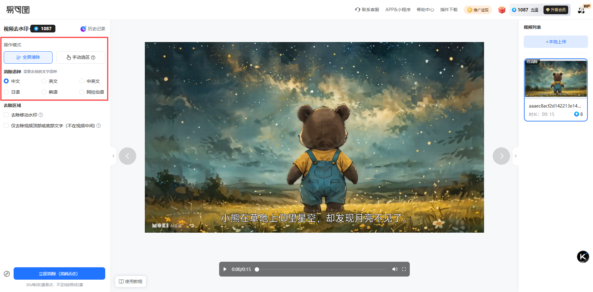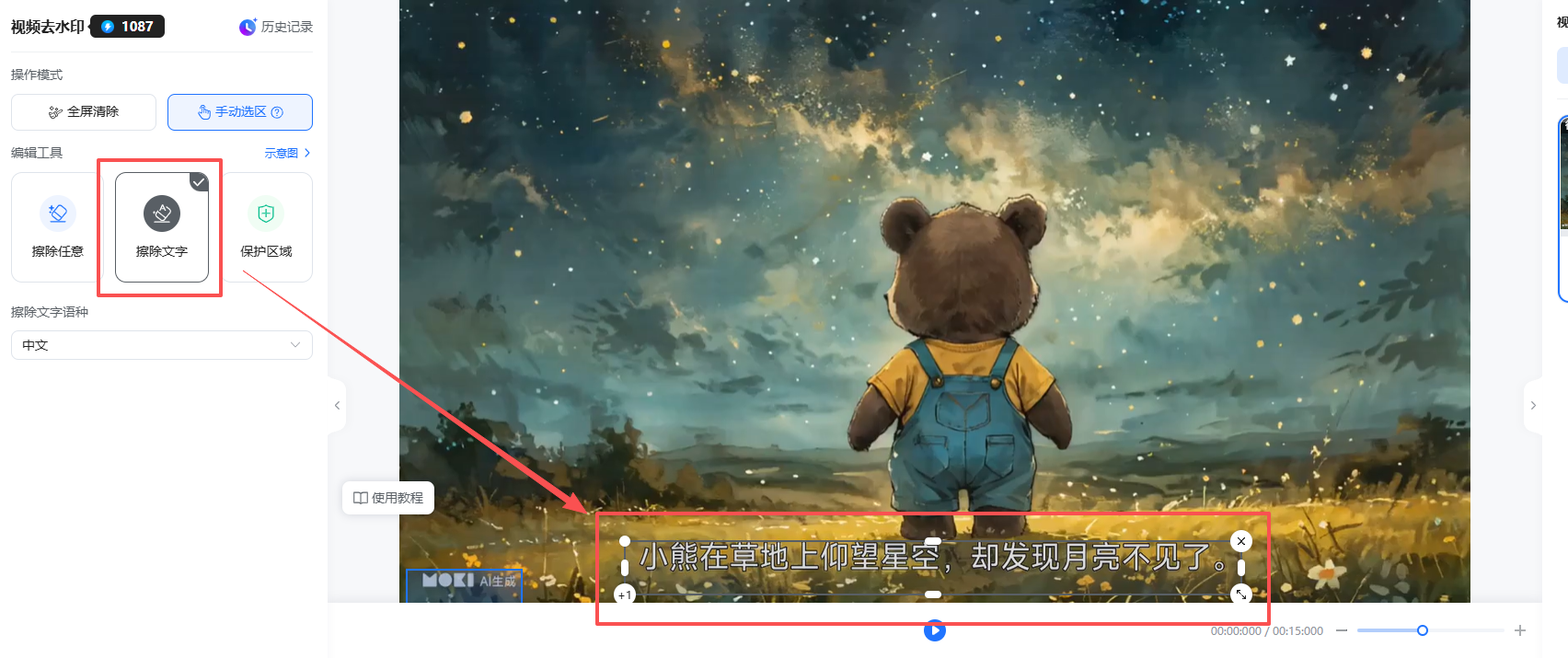 擦除文字:用于擦除视频中的文字、字幕内容,下方选择要擦除的语种