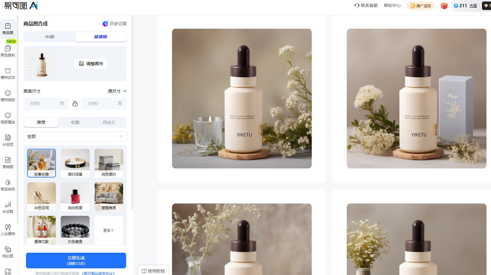 5.生成图片:点击“立即生成” 按钮,稍等片刻,您的商品新场景图就会呈现!