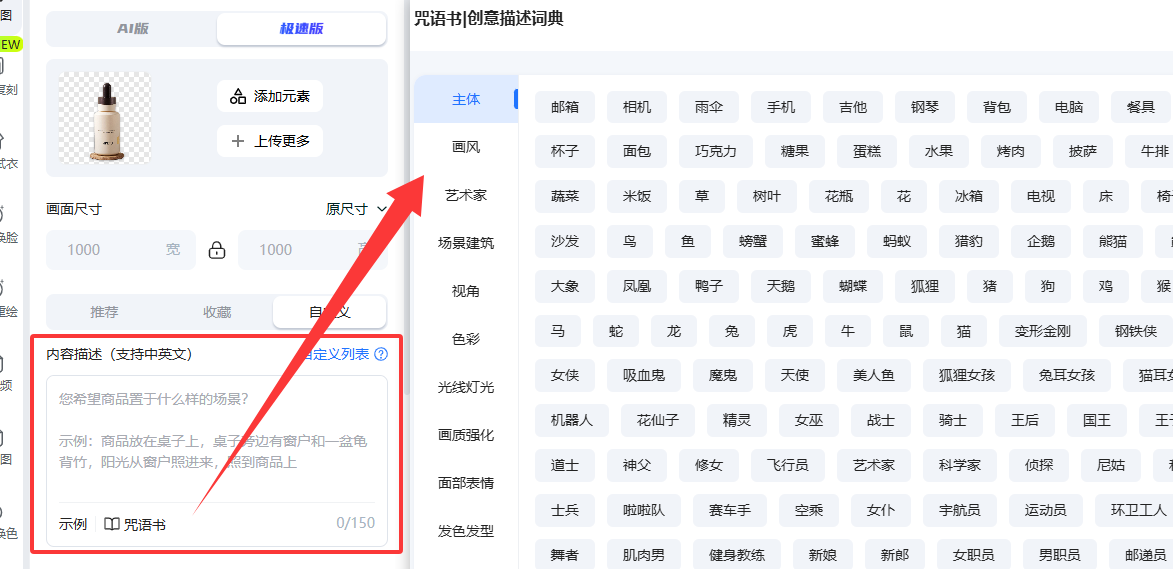 ①输入文字描述:手动输入您想要的场景关键词(可参考“咒语书”获取灵感)。
