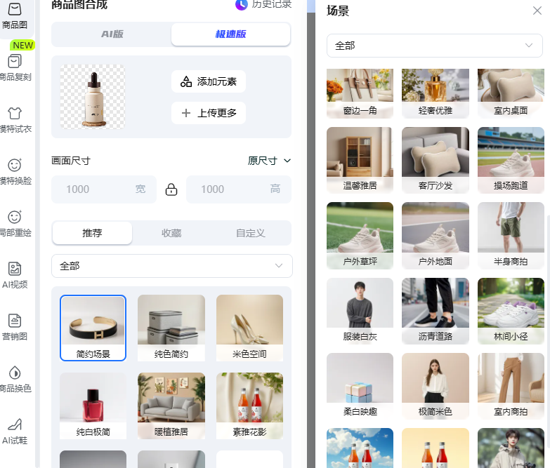 AI商品图极速版功能位于【AI商拍/设计】中,该功能可助您快速制作商品精修图:自动抠取商品主体,并一键替换多种拍摄背景,并且极速版生成后的商品图,可以对商品图内的商品进行移动、放大等操作。
