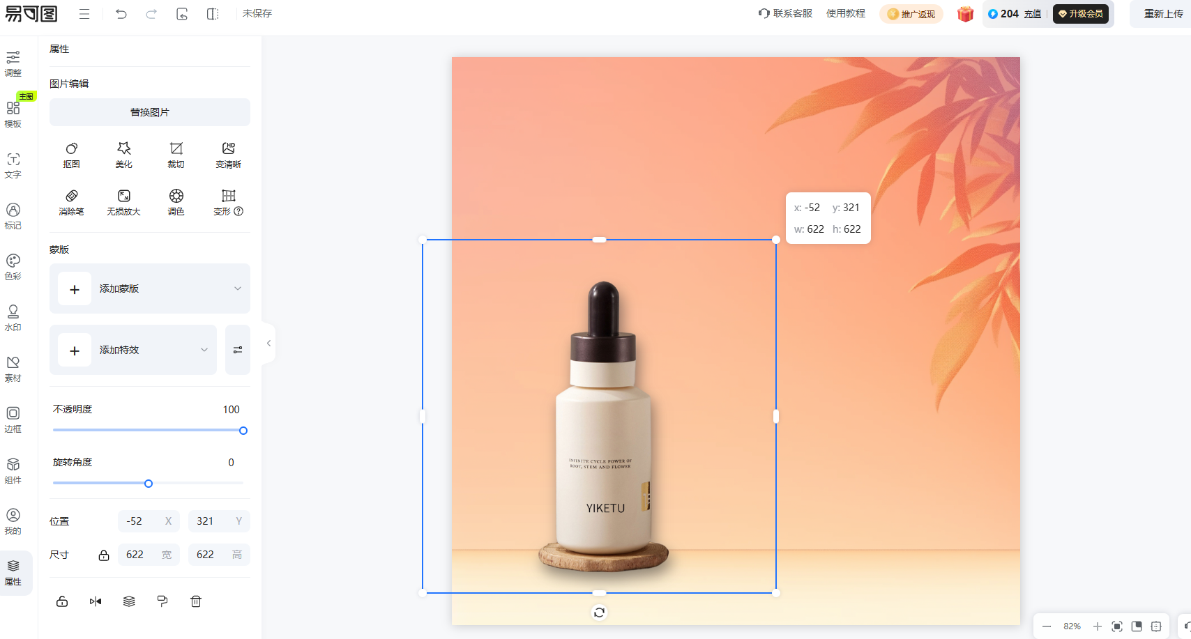 6.二次调整:选择商品图,点击【立即编辑】,可以进入图片编辑器调整商品主体的位置、大小和选择角度等。